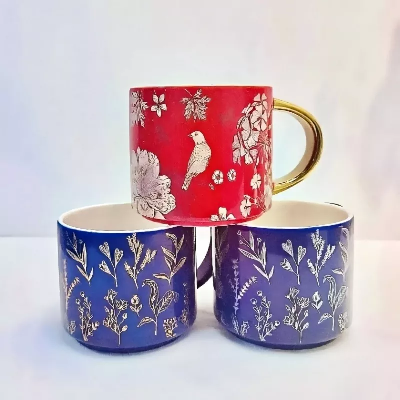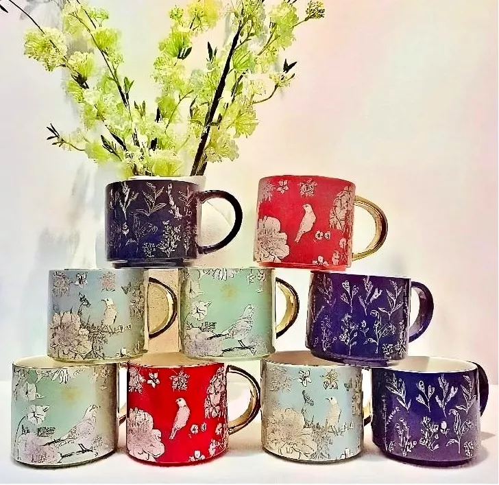 Tämä keraaminen muki, jossa on elektropulaatoitu kultakahva, joka on valmistettu tarroilla huolellisesti, ilmentää luonnon inspiroimaa ainutlaatuista viehätysvoimaa. Olipa kyseessä kukkivien kukkien, ketterien lintujen elinvoimaiset muodot tai luonnollisten värilohkojen kiehtovat kuviot, muki vangitsee herkästi kasvisto-, eläimistön ja vilkkaiden värien lahjat. Jokaisen tyylin sopimaan mukin kahva on muokattavissa. Kultapinnoitettu versio loistaa rikkaalla, kultaisella sävyllä, joka muistuttaa 18K kultaa lisäämällä ripaus hienostuneisuutta. Se voidaan myös räätälöidä suosikkiväriisi.