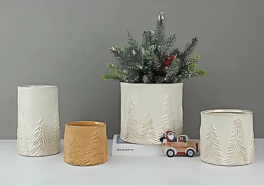 Kohokuvioitu joulumäntymaljakko käyttää klassista mäntykuviota pääelementtinä, joka edustaa joustavuutta ja pitkäikäisyyttä, kestävää teemaa talveen ja lomakauteen. Kohokuviointitekniikka ei vain lisää visuaalista syvyyttä, vaan myös tuo mukanaan käsintehdyn lämmön ja taiteellisen keräilyarvon tunteen, joka ylittää huomattavasti tavalliset muovikoristeet. Lisäksi käytännöllisiä muotoja ovat klassiset lieriömäiset, vakaat neliömäiset jalustat ja tyylikkäät soikeat kuviot, joita voidaan käyttää itsenäisesti taideteoksina tai istuu täydellisesti kasveihin. Osana tuotesarjaa näitä erikokoisia ja -mallisia kukkaruukkuja voidaan vapaasti yhdistellä ja järjestellä (kuten viuhkan muotoon tai riveihin) luodakseen kerrostetun ja visuaalisesti upean pöytämaiseman.